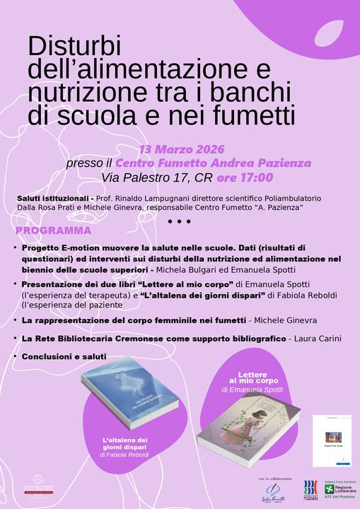 In occasione della Settimana Lilla (e la relativa Giornata Nazionale del 15 marzo), dedicata alla sensibilizzazione sui Disturbi della Nutrizione e dell’Alimentazione (DNA), il Centro Fumetto ospiterà Venerdì 13 marzo alle ore 17.00 al Centro Fumetto un incontro sui disturbi dell’alimentazione tra i banchi di scuola e nei fumetti.