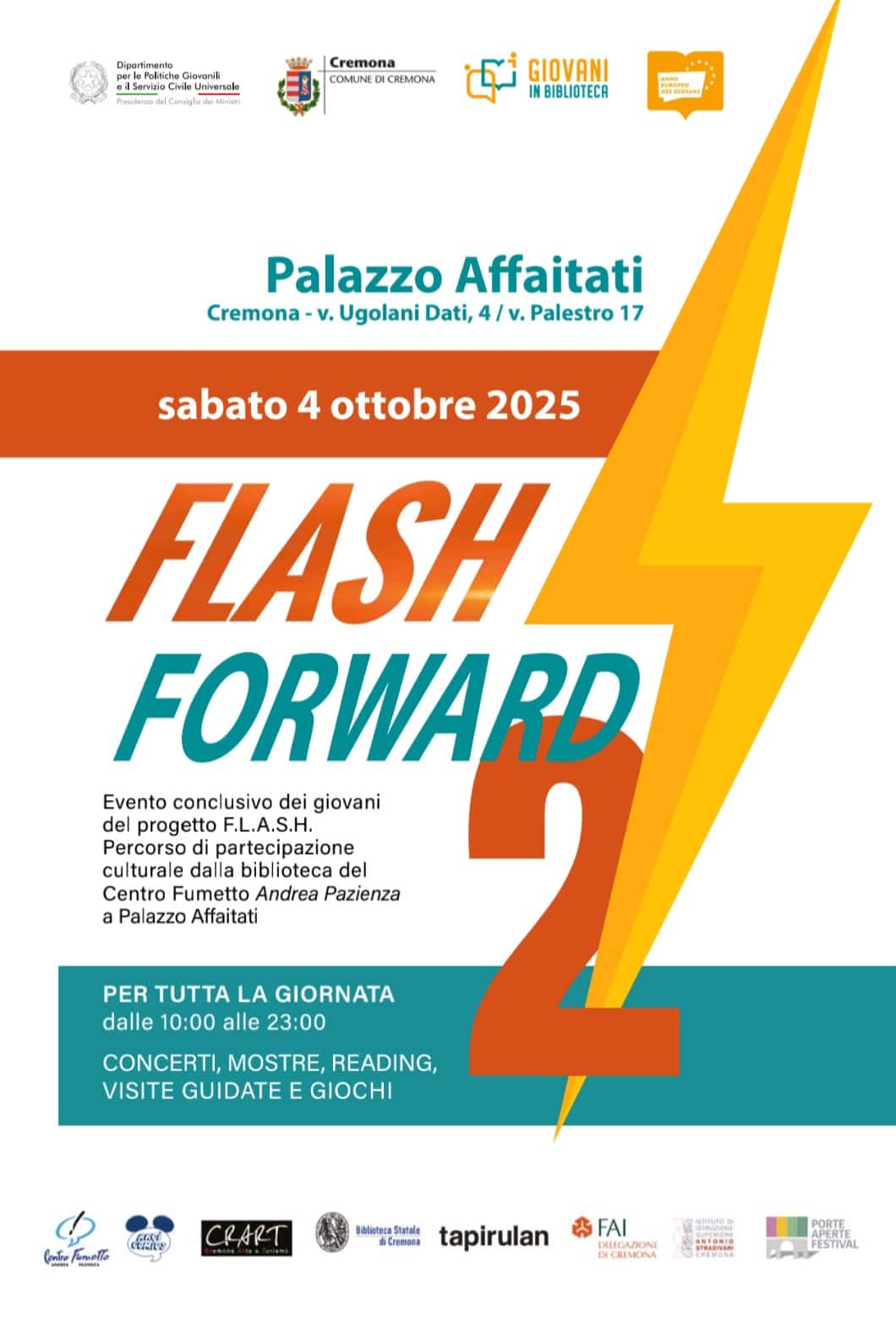 Il progetto era strutturato in percorsi laboratoriali e partecipativi finalizzati alla realizzazione di eventi culturali, pensati negli spazi del Centro Fumetto “Andrea Pazienza”, da realizzare nell’intero complesso di Palazzo Affaitati, che comprende anche Informagiovani, Museo Civico Ala Ponzone, Museo di Storia Naturale, Piccola Biblioteca e Biblioteca Statale. I percorsi, rivolti sia ai giovani tra i 14 e i 19 anni che a quelli tra i 20 e 35 anni, consistevano in laboratori tematici e tavoli di progettazione. Gli argomenti erano fumetto, illustrazione, progettazione mostre, promozione lettura e biblioteche, memoria locale, organizzazione eventi, tutela del patrimonio culturale. Ad ogni tema hanno lavorato sia i partecipanti di età compresa tra i 14 e i 19 anni che quelli tra i 20 e i 35 anni. L’Istituto d’Istruzione Superiore “Antonio Stradivari”di Cremona ha collaborato, in qualità di partner, attivando sessanta PCTO (Percorsi per le Competenze Trasversali e per l’Orientamento) interni. I suoi studenti sono stati i principali protagonisti dei percorsi tematici e dell’evento Flash Forward tenutosi il 14 e 15 giugno. Flash Forward 2, in programma sabato 4 ottobre, è il secondo evento di restituzione del gruppo appartenente alla fascia 20-35 anni. Hanno collaborato in qualità di partner di progetto anche la Biblioteca Statale, Arcicomics, Centro Fumetto “Andrea Pazienza”, CrArT, Porte Aperte Festival, Tapirulan e il Comitato FAI Cremona.